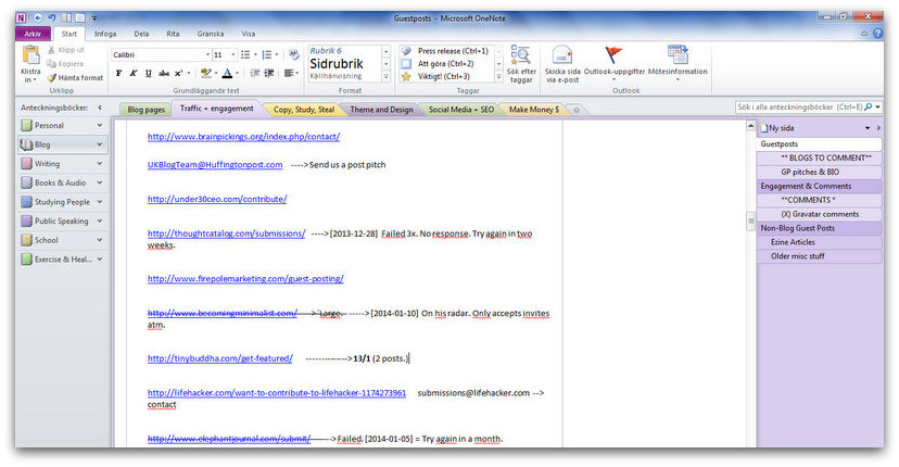 Starting now, every time you see a website/blog/company/person that you find interesting and would like to pitch or get in contact with, you’re going to copy paste the URLs to these sections.