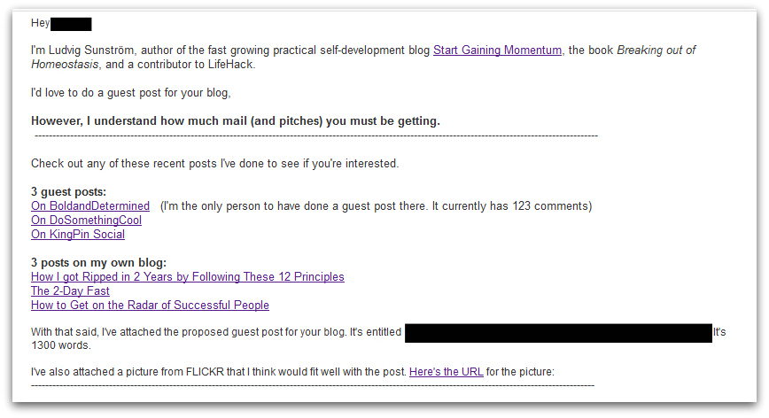 (In this example it’s a guest post being pitched, but this is essentially how you’d go about pitching anything to a busy person. The fundamentals are the same.)