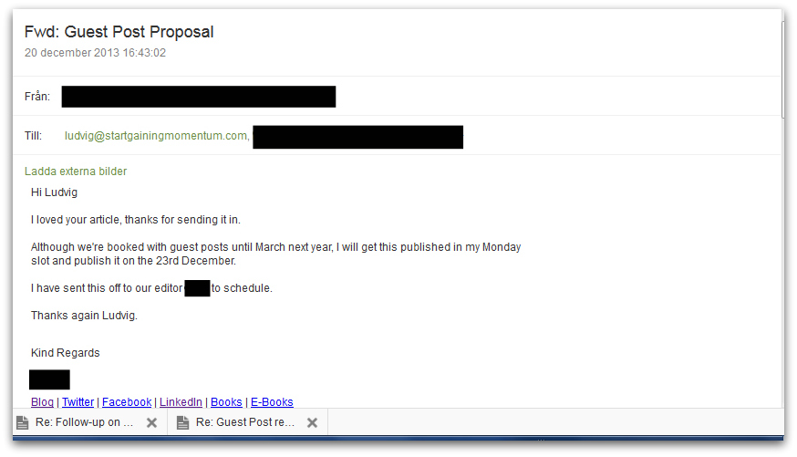 - I used social proof. First I mentioned that I have a fast-growing blog (this is risky, don’t do it if it’s not true), and when they check out my blog they see it’s correct. Second, I mention being a contributor to LifeHack, that’s also somewhat impressive. Third, I have written a book, that stands out too. Fourth, I tell them the number of comments on the post and that I was the first person to do a guest post at Bold and Determined.