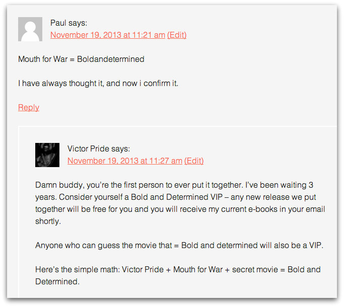 We are a small community of men who simply wish to be free men. I created manoffreedom.com simply for that reason. Victor lit a fire under my ass to start. It’s amazing how a stranger can have so much influence over you, and help you change. I will always be a loyal reader of this blog and I will continue to apply the principles of 30 Days of Disciple until this young man becomes an old man.