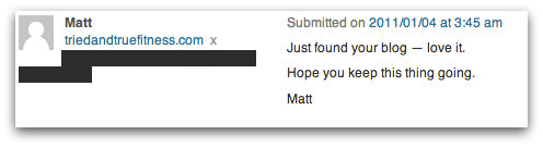 Our first comment came in January, 2011, two months after launch, from Mr. Matt Marshall. I never told him, or anyone, but Matt's old blog Tried and True fitness was my #1 favorite blog at the time. Until then I had had no feedback whatsoever about the blog. Matt's comment fired me up and I knew right away that I had a winner.
