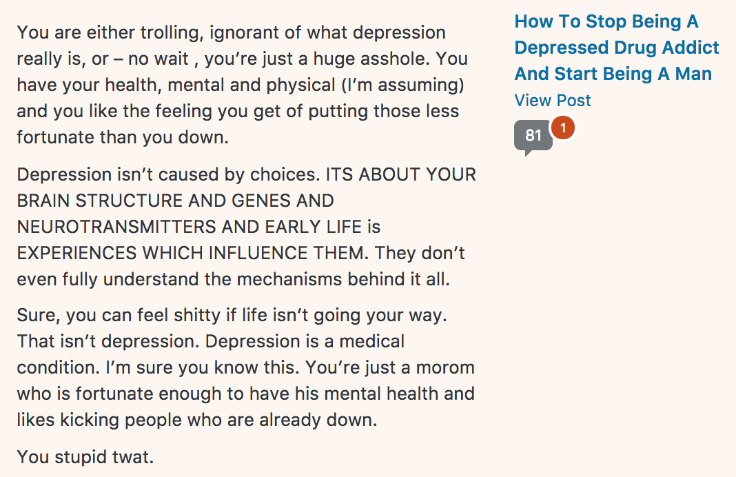 - A huge amount of typos. There are always numerous typos in these comments because these people are always drunk on alcohol or high on drugs when they leave these “poor me” comments. This is one reason you never want to use alcohol or narcotics, you don't want to be a “morom” like this commenter