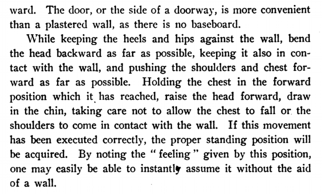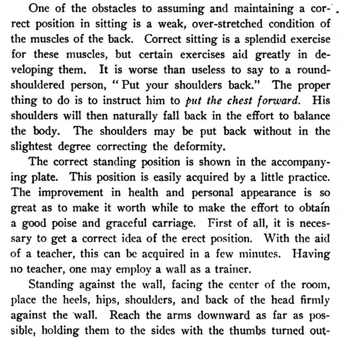These posture photos and text are from J.H. Kellogg's very interesting book The Living Temple (you can read the PDF for free here). Kellogg was a physician famous for developing Kellogg's Corn Flakes as an “anti-masturbation” food. Well, that's what people who have never read his book say. Many people have dismissed Dr. Kellogg as an old fuddy-duddy, vegetarian, killjoy who wanted no one to have a good time. I find those people to have entirely missed the point, as his book was quite excellent and thorough. The largest portion of Dr. Kellogg's book is in relation to human digestion and was a very valuable resource for that and for many other things. Here are Dr. Kellogg's views on achieving perfect posture: