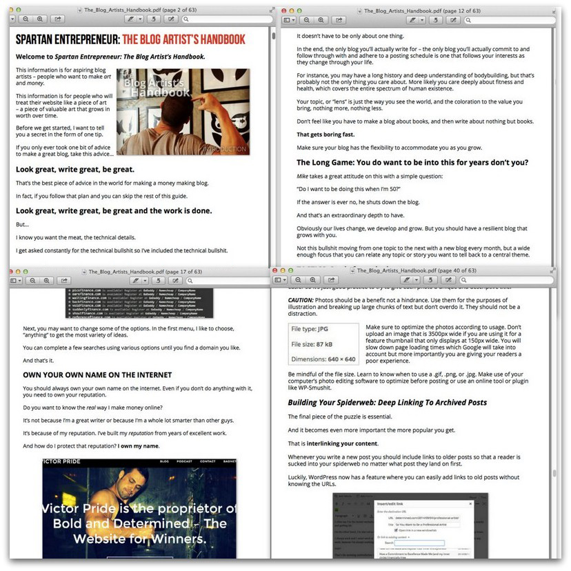 Scott said: “Thanks for sending Spartan Entrepreneur out for free. I read it yesterday and must say this has to be some of your best work yet. Its pure gold. I thought I knew a lot about becoming a Blog Artist but I was wrong. I appreciate you including the dry technical stuff as well. I didn’t know much about security and many other resources that are in the book. I’ll have to go back into it and re-read and apply much of the info.