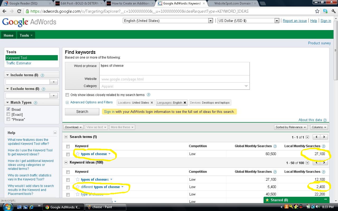 Check the google keyword tool to see how many people are searching for your keyword each month. Let's assume you want to create a product about different types of cheese. We will use the google keyword tool to see how many people are searching for the different types of cheeses.