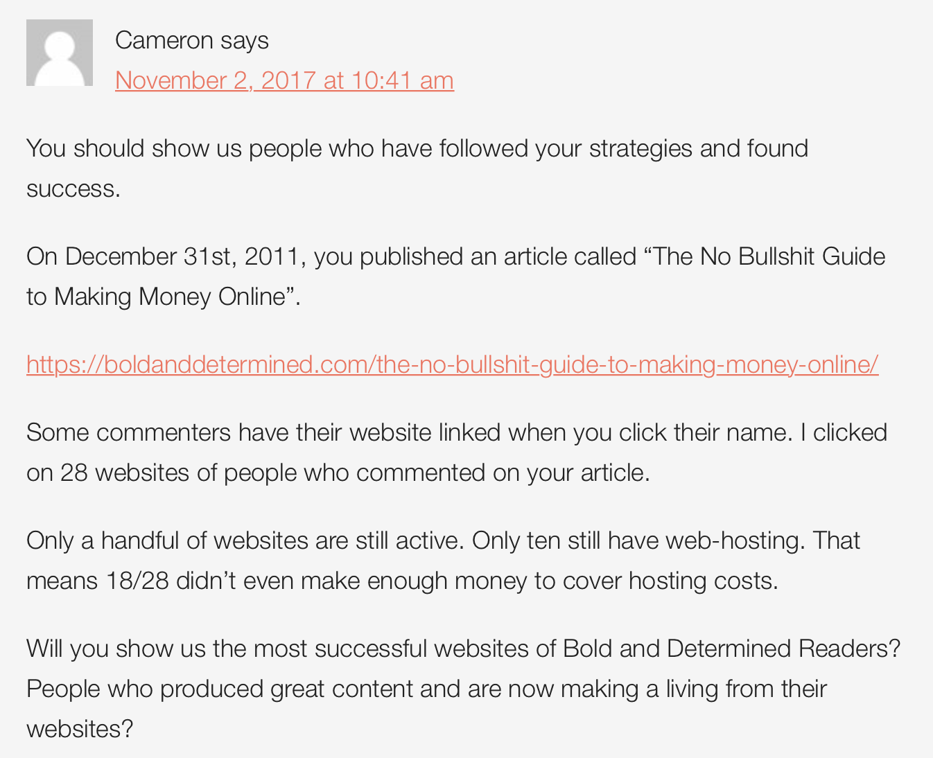 “Will you show us the most successful websites of Bold and Determined Readers? People who produced great content and are now making a living from their websites? ”