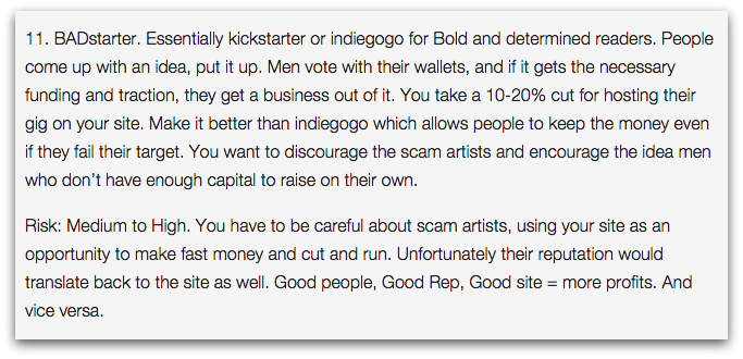 -Sattelite blogs with watered down content, to gain steam and transform a mild but once unteachable demographic into a possibly Bold and Determined one. This site you say you write for winners. Make another one that shows losers there is another way. With popularity, begin subtly linking to B&D.