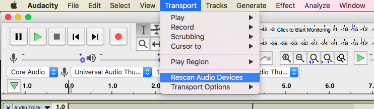 NOTE: If your device is not showing up in this list, do this: Choose Transport -> Rescan Audio Devices