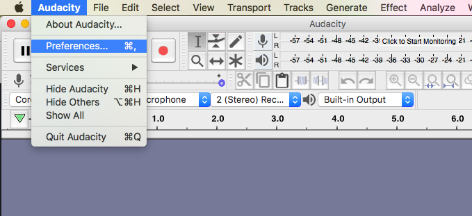 - Follow these menu steps: Audacity -> Preferences -> Devices