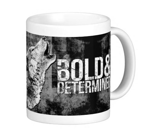 Classic white coffee mug with dark variation of the Bold & Determined ‘howling wolf’ design
