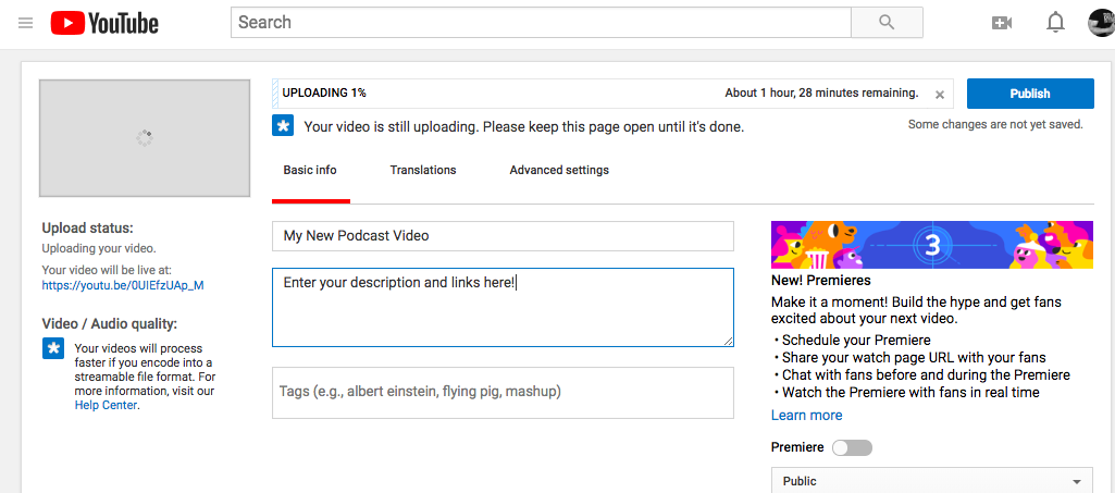 Now you podcast video is live. You can send the link to your podcast followers and they can watch/listen to your podcast on YouTube.